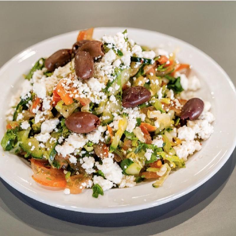Comes with lettuce, tomato, pickles, onions, feta cheese, tahini sauce, eggplant, & cauliflower.