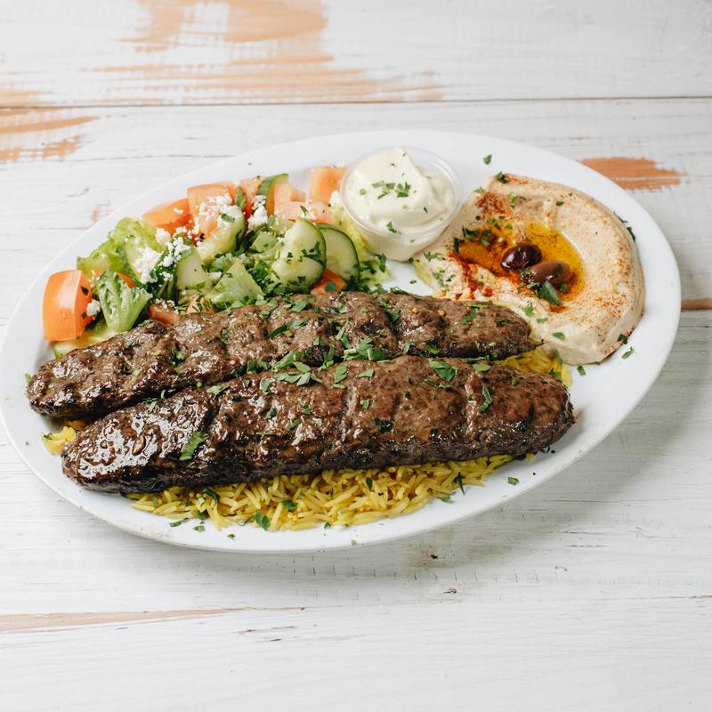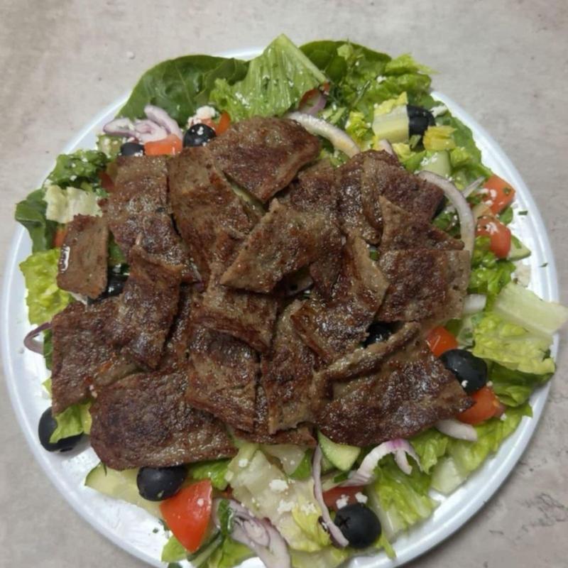 5 Beef and lamb gyro plates. Served with hummus, salad, and rice.