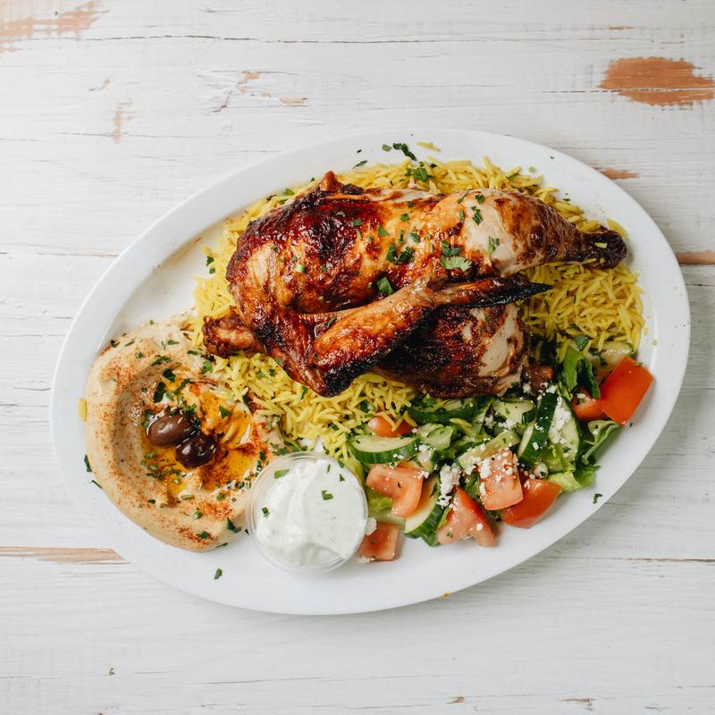 Enough for 2-4 • Whole chicken, large hummus, large rice, side of pickles, 4 pita bread, and garlic sauce