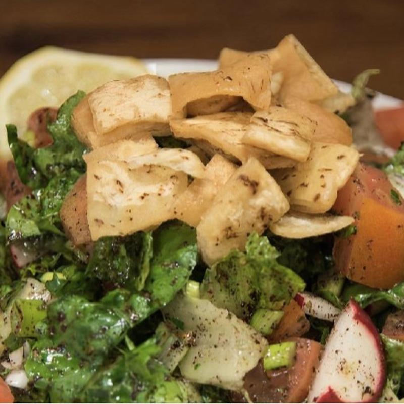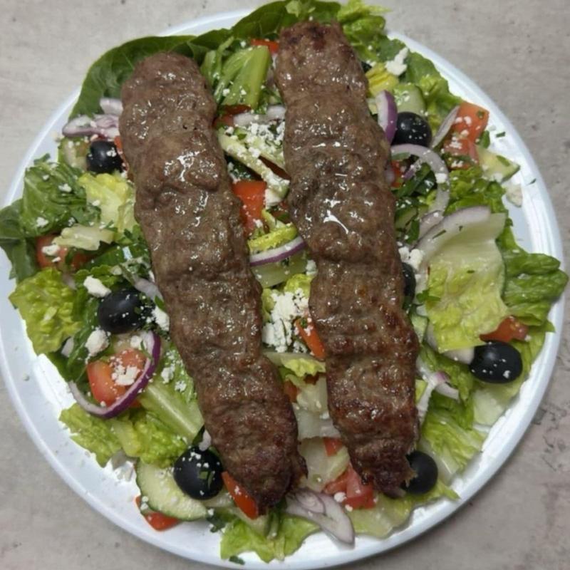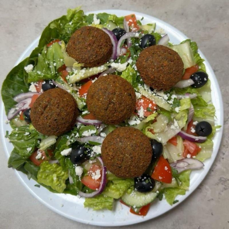 Comes with lettuce, tomato, pickles, onions, feta cheese, tahini sauce and a touch of hummus.