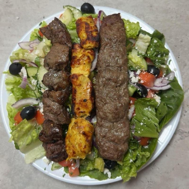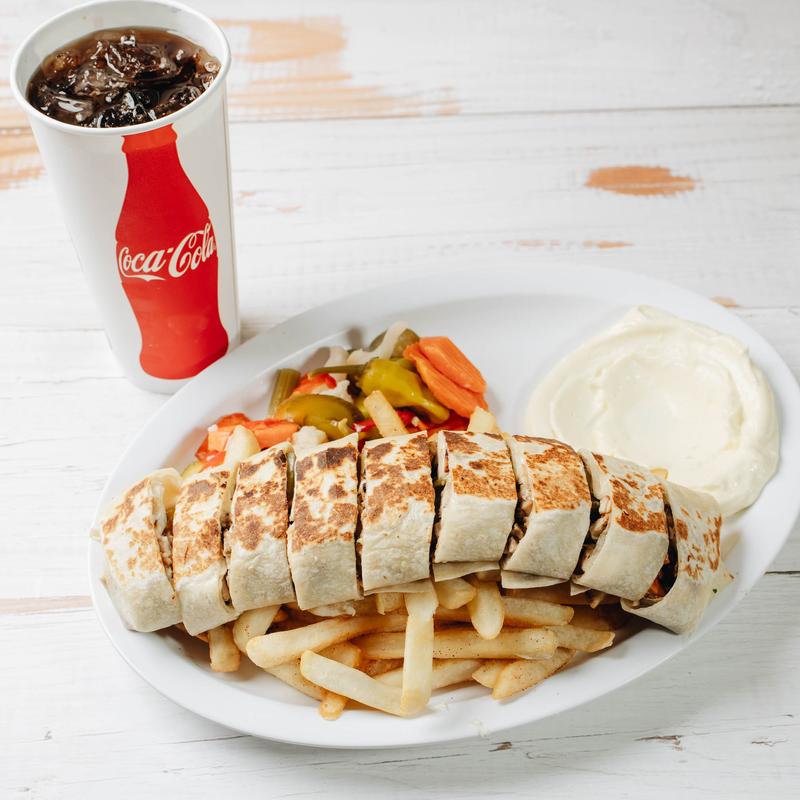 3 wraps- each filled with beef shawarma slices, onions, tomatoes, parsley and Tahini sauce. Served with fries, side of garlic sauce and side of mixed vegetables.