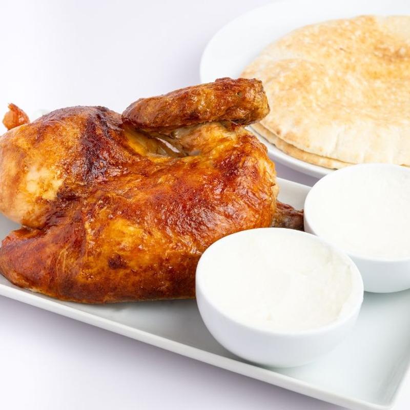 Enough for 2: Whole Chicken, 2 pita bread, 2 Garlic sauces and side of pickles.