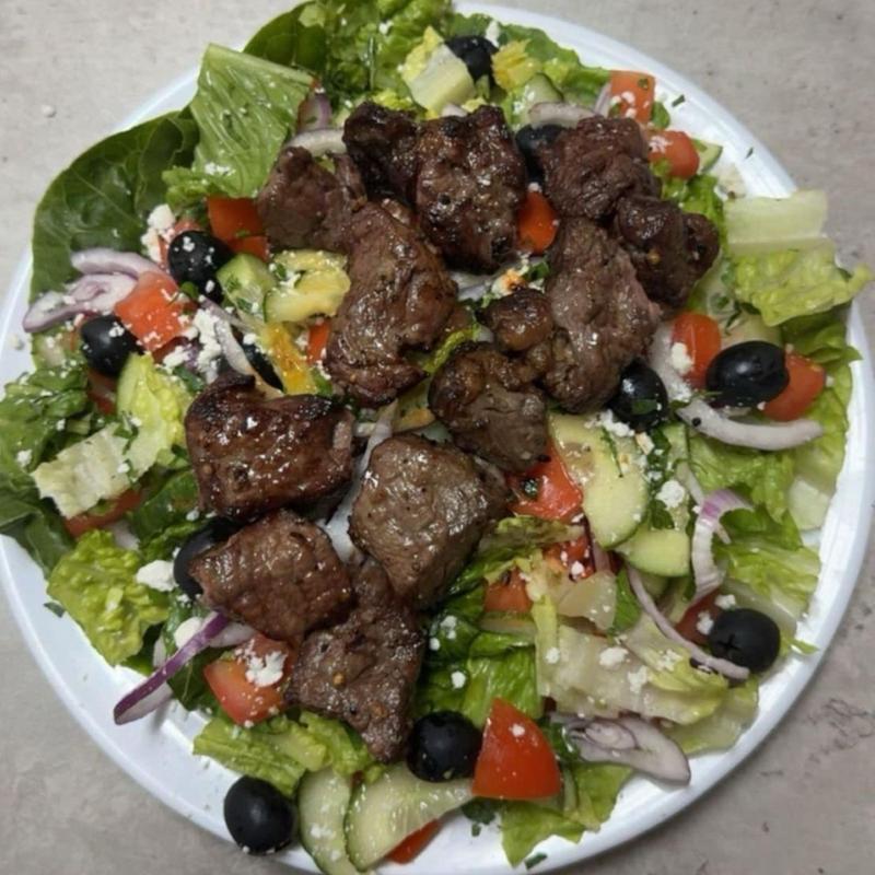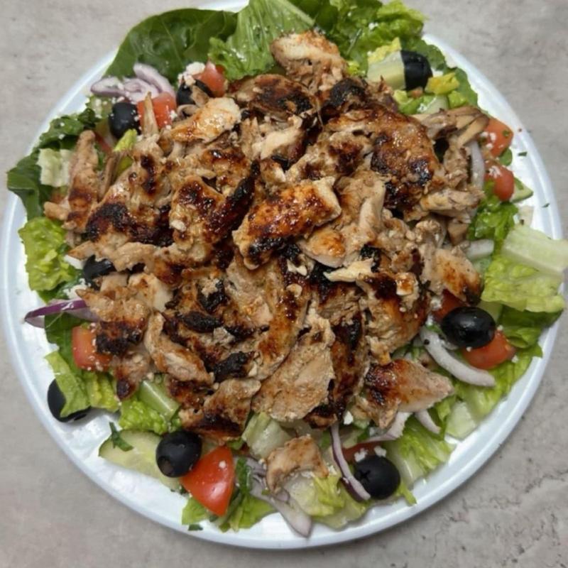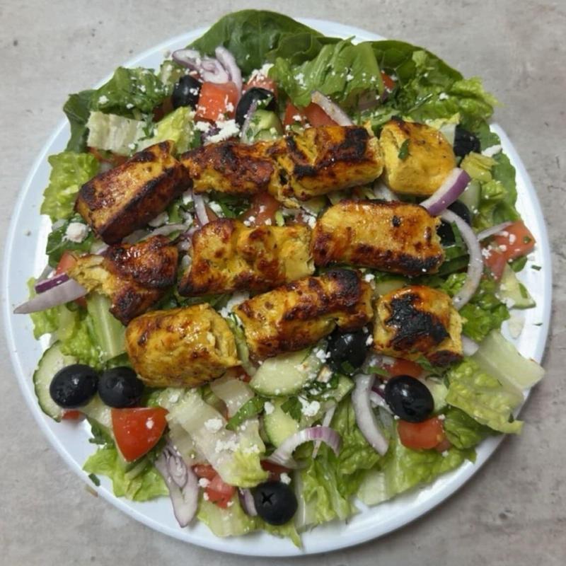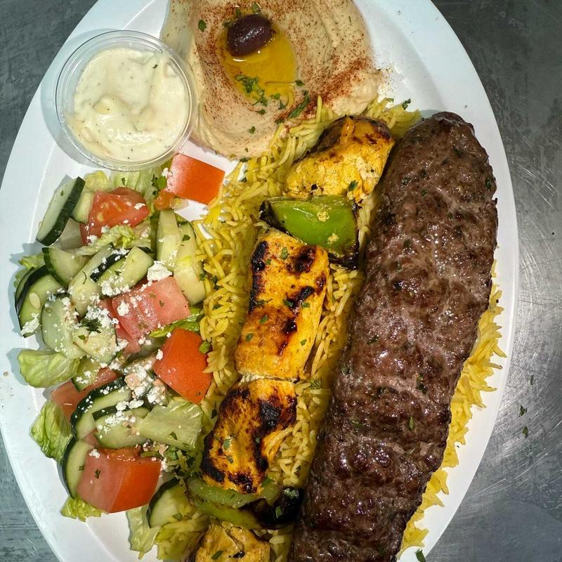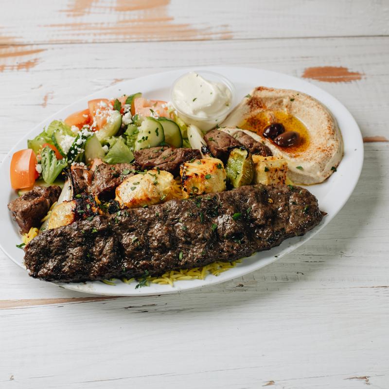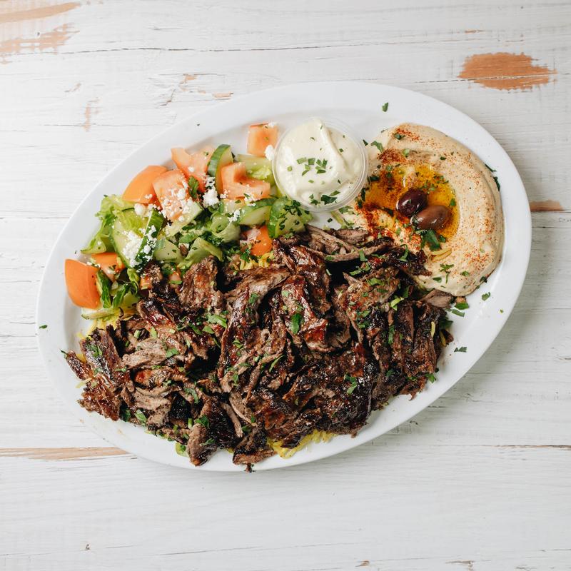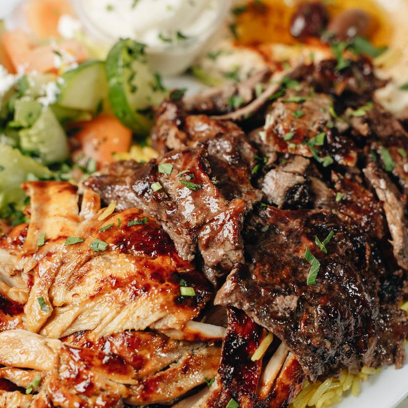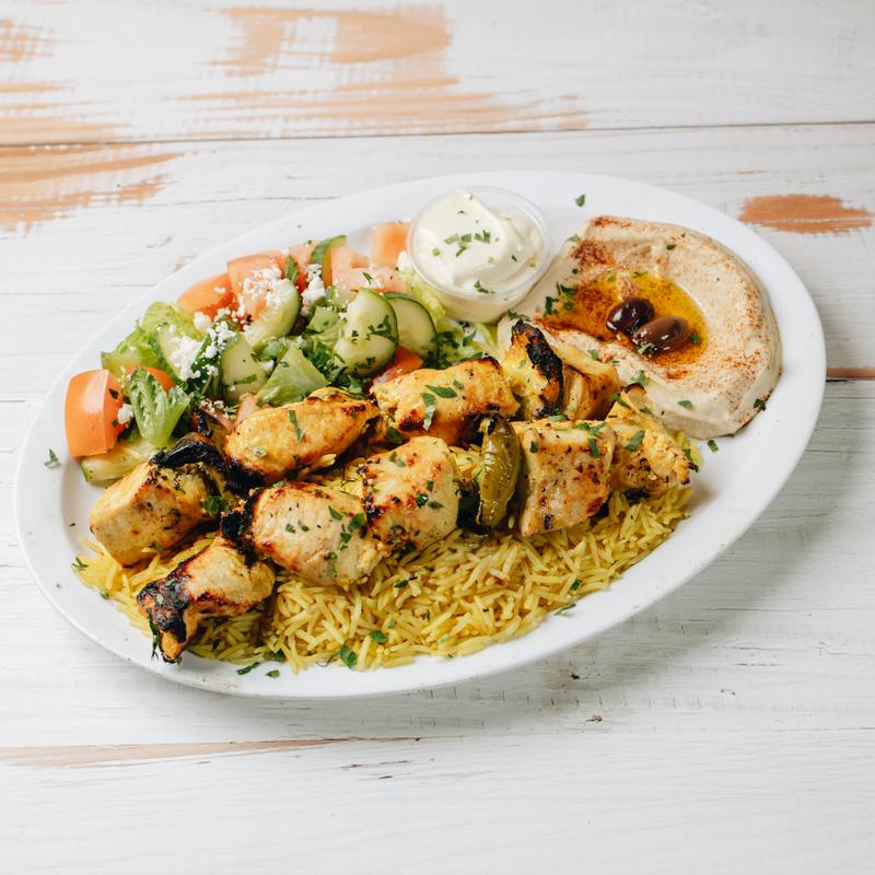All plates come with a choice of protein option, rice, hummus, salad, pita bread, and a choice of sauce (Garlic, Tzatziki, Tahini).