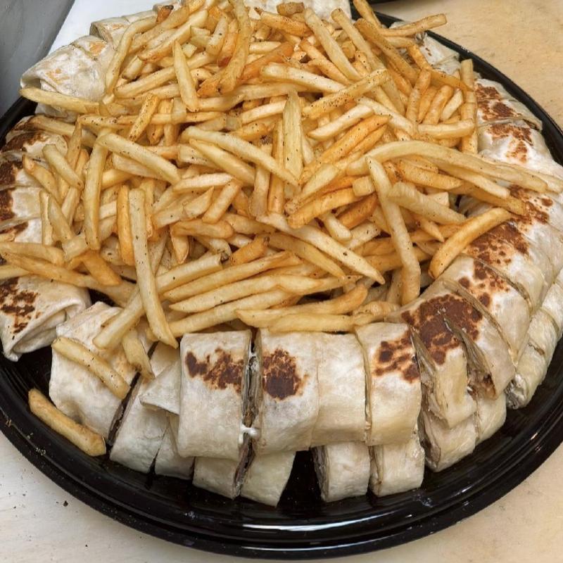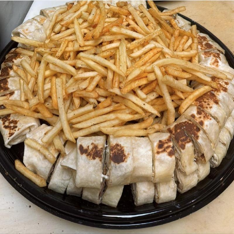 5 wraps- each filled with beef shawarma slices, onions, tomatoes, parsley and Tahini sauce. Served with fries, side of garlic sauce and side of mixed vegetables.