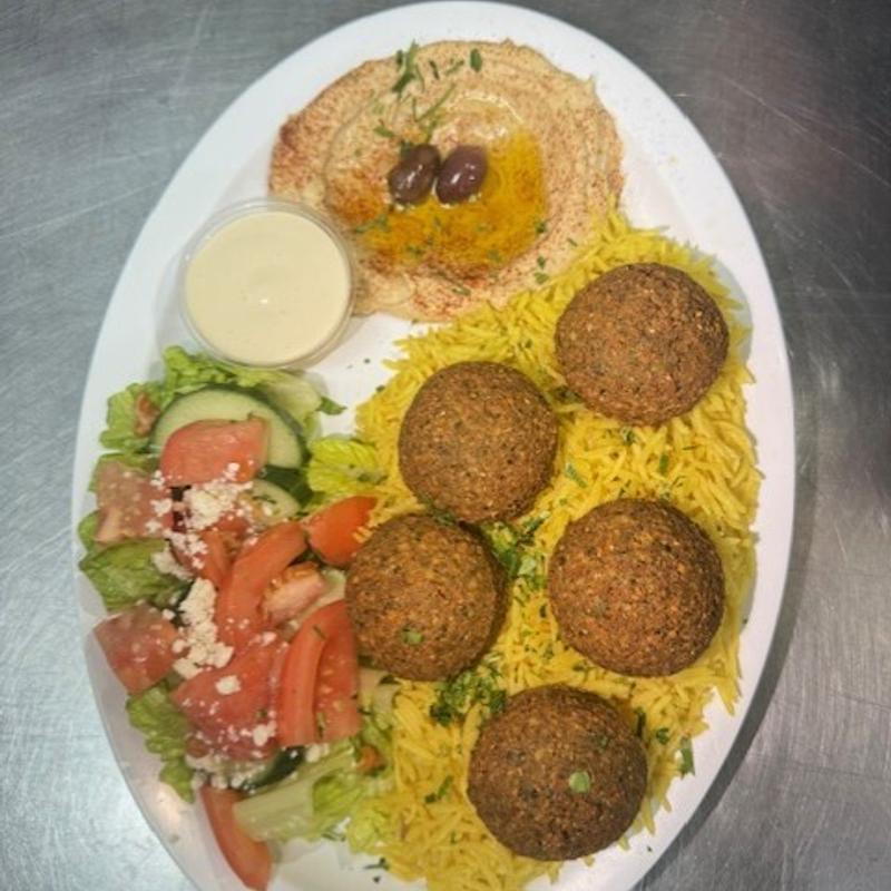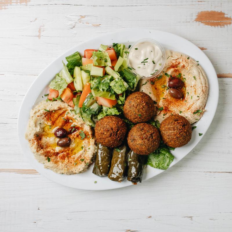 4 falafel, 3 dolmades, side of hummus, side of baba Ghanouj, 2 pitas.