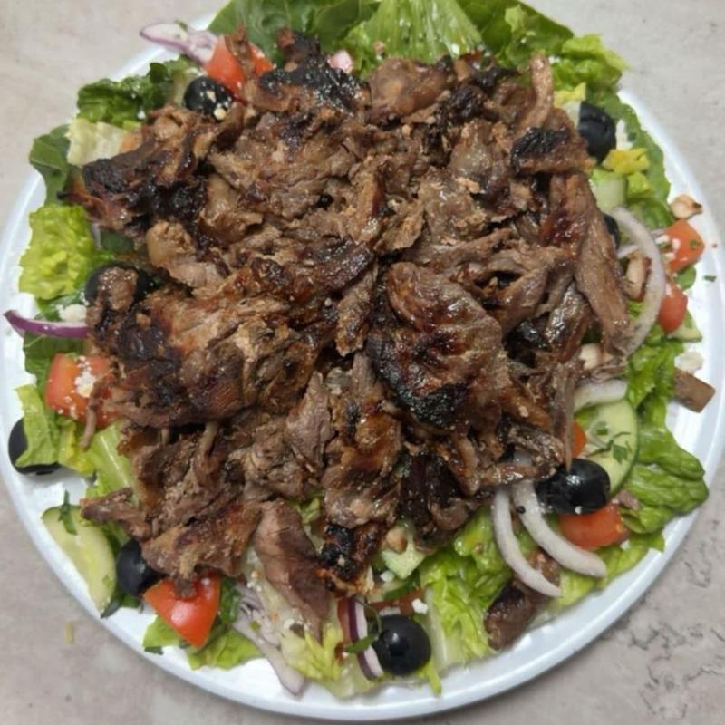 5 Beef shawarma plates. Served with hummus, salad, and rice.