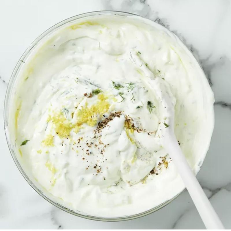 Comes with lettuce, tomato, pickles, onions, feta cheese, tzatziki sauce and a touch of hummus.