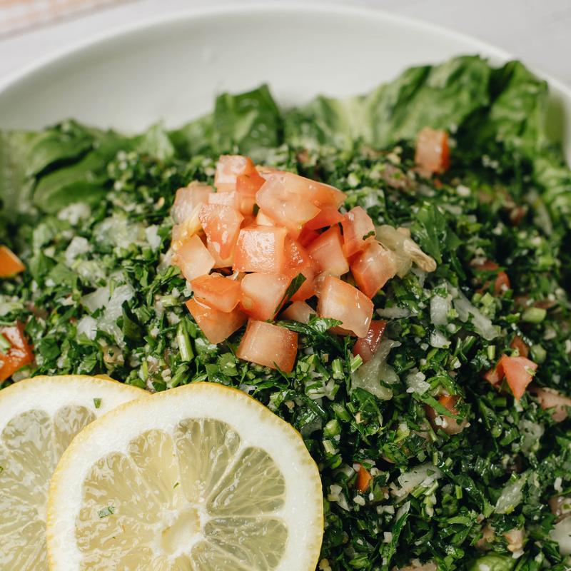 Parsley, tomato, cucumber, cracked wheat, lemon, and olive oil.