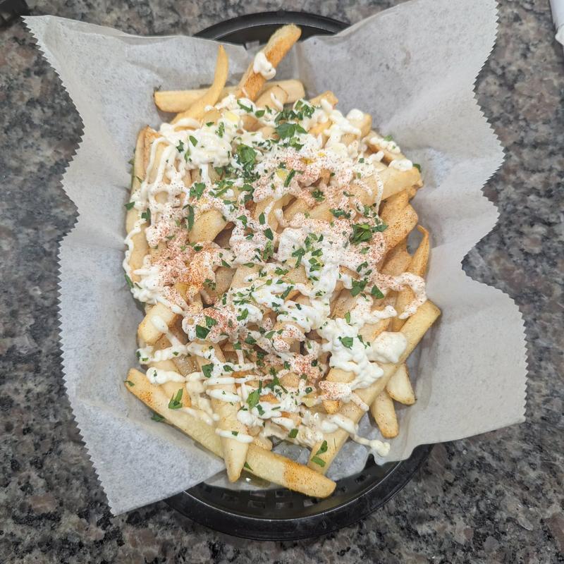 3 wraps- each filled with chicken shawarma slices, pickles, Garlic sauce. Served with fries, side of garlic sauce and side of mixed vegetables.